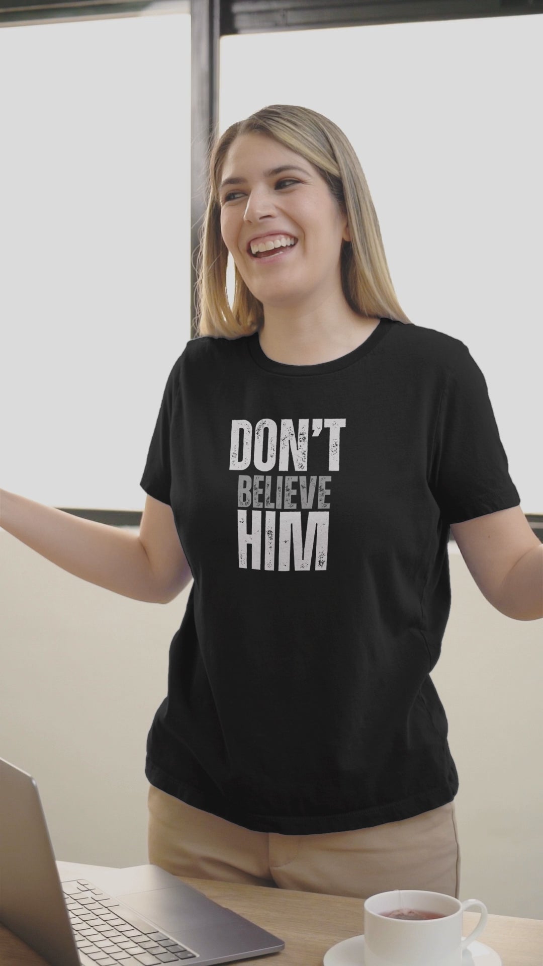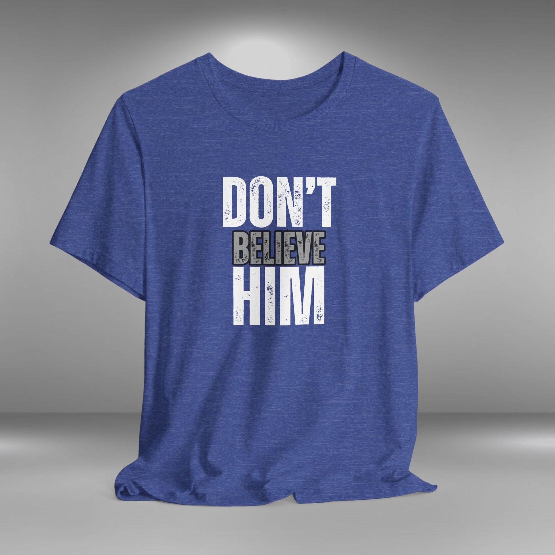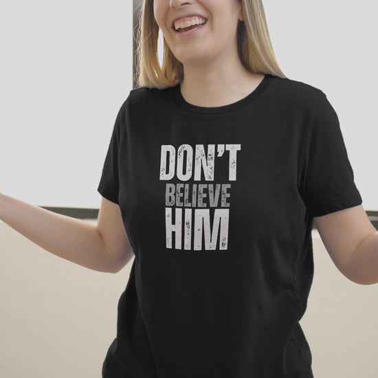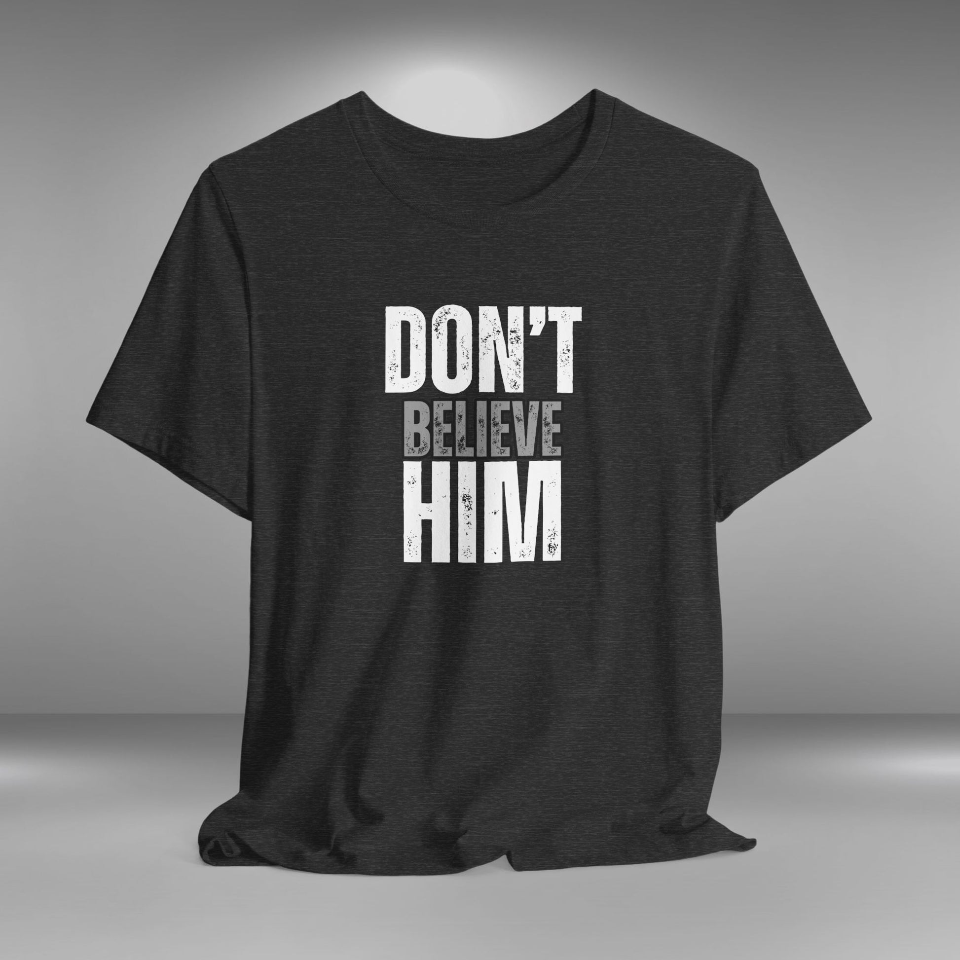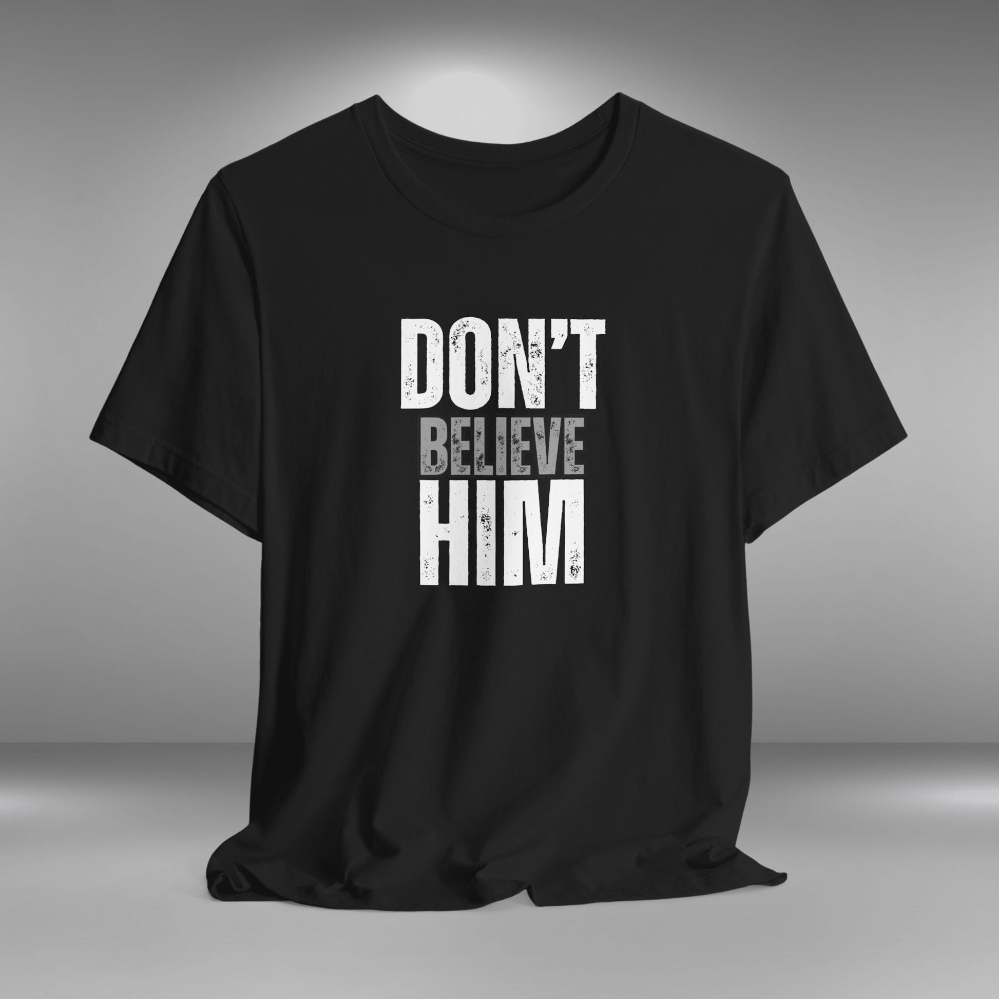 Fun T-shirt with a warning 'Don't Believe Him', perfect for anyone who has been lied to and wants to send a clear message. This political tee is ideal for casual wear and makes a bold statement. Relevant for those looking to express their opinion and stand out in a crowd. Great for gift-giving during political events or as a statement piece during protests or rallies.