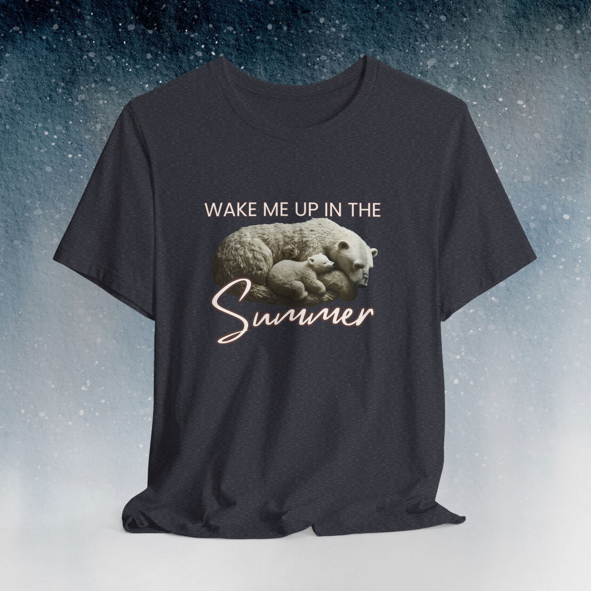 Celebrate hibernation with the "Wake Me Up In The Summer" T-shirt featuring a Mama bear and her cub. A cute and fun design perfect for lazy winter days. This T-shirt is lightweight, breathable, and versatile, making it ideal for active and leisure wear. The retail fit and classic crew neckline add a neat style suitable for casual and semi-formal settings. Perfect for those who love summer vibes and cute bear designs. Great for gifting on Mother's Day or any occasion.